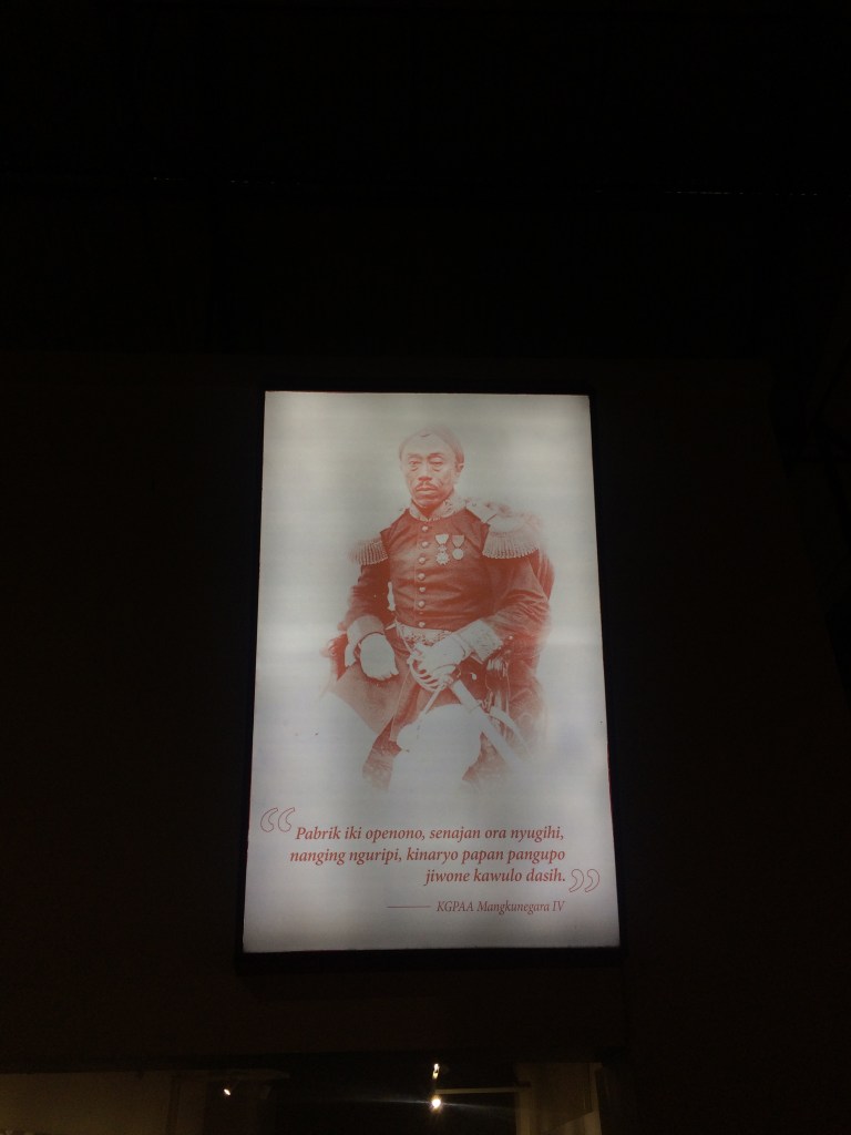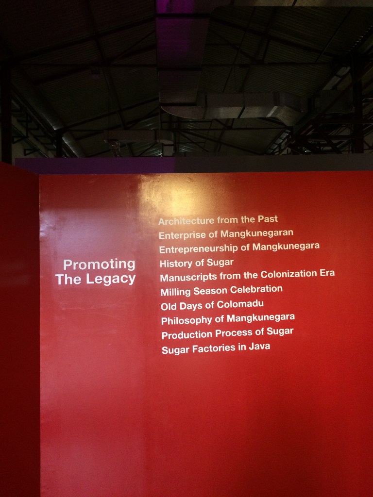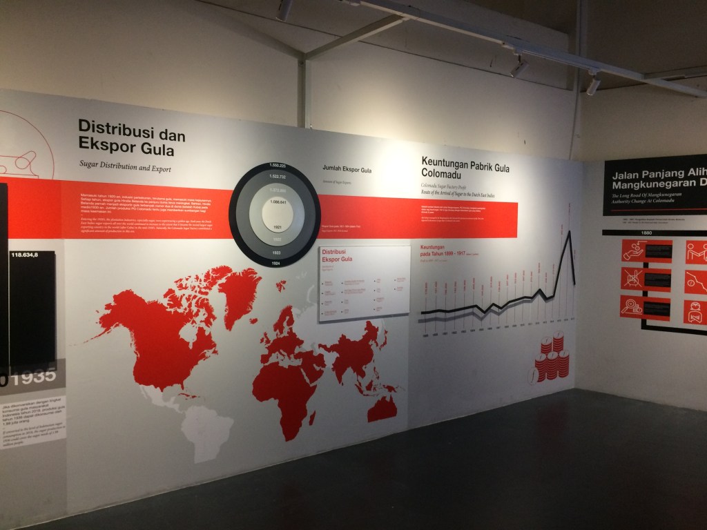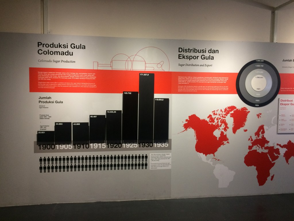 Dalam lorong gelap beralur, kita diajak mendalami sejarah Pabrik Gula Colomadu dari berdiri hingga masa mari surinya. Serangkaian infografis dalam warna putih dan merah tersaji cukup informatif. Lengkap dengan sederet data statistik yang berisi keterangan jumlah produksi, keuntungan pabrik, hingga kronik tahun per tahun.